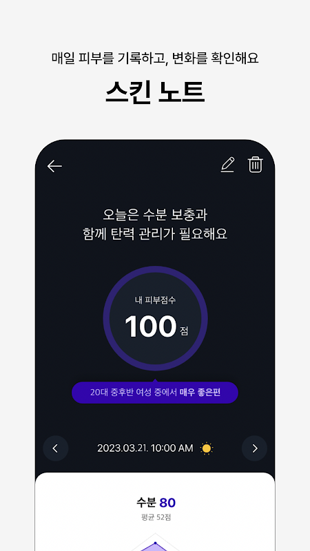 毎日の肌と自分のスキンケアルーチンを記録し、肌の変化を観察してください。明日の肌がより良くなるように些細な変化までお見逃しなくお届けします。