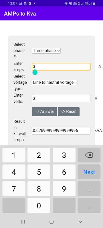 このアプリを使用すると、アンペアから kva(キロボルトアンペア) への変換が簡単になります