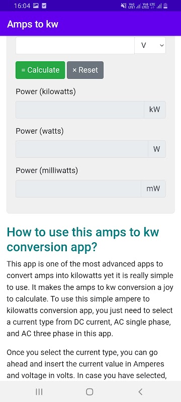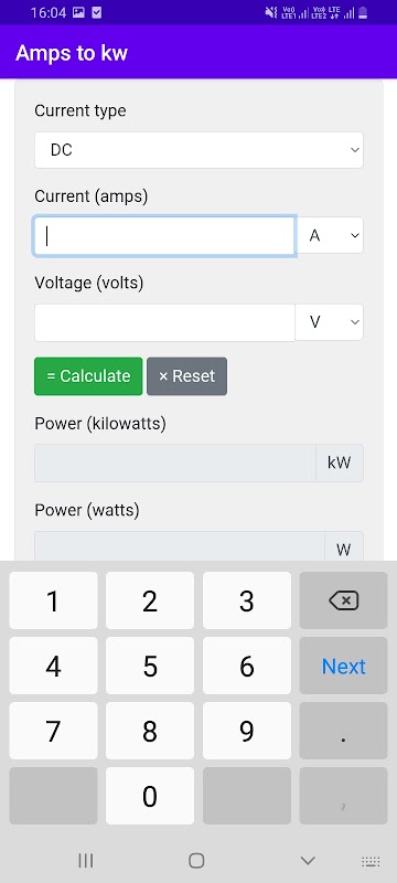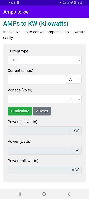 このAMPからkwへの変換アプリを使用するには、DC、AC、およびAC 3フェーズから電流タイプを選択するだけです。電流タイプを選択したら、電流単位をアンペアで、電圧をボルトでテキストボックス内に挿入し、変換ボタンをタップする必要があります。