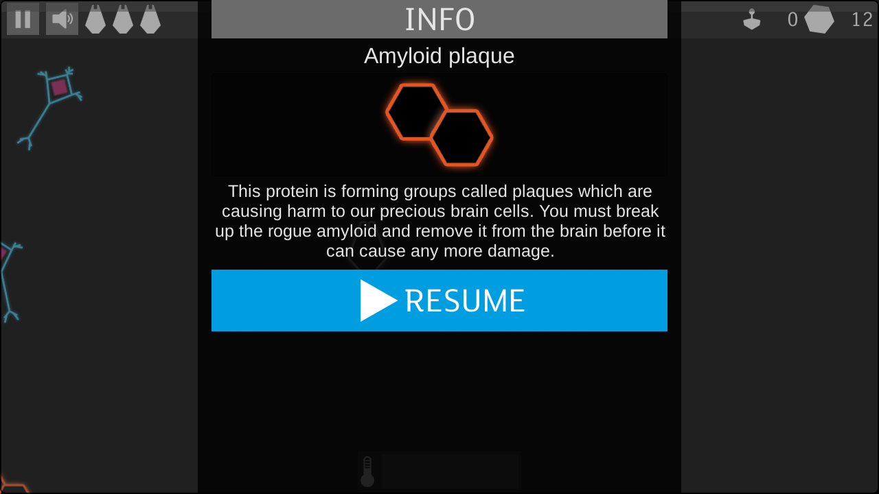 Our intelligence suggests that the proteins amyloid and tau are forming groups which are harmful to brain cells. Using your world-class scientific skills, you must enter the brain to break up the gathering amyloid army and heal brain cells that are under the grip of tau.