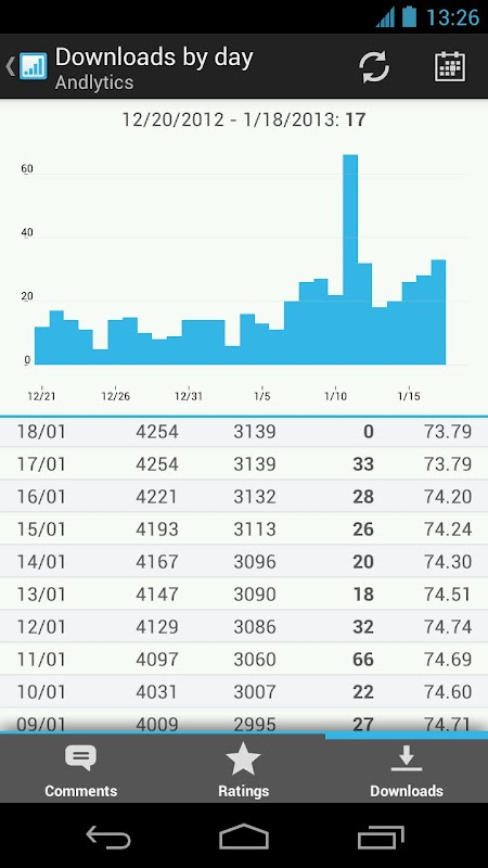 Andlytics は、Google Play 開発者コンソールからアプリについての統計情報を収集しています。アプリの評価、日次ダウンロード数、総合ダウンロード数と有効インストール数を簡単にトラキングできます。