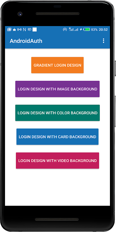 5 xml designs including Gradient design, Image background design, Color background design, Card background design and Video background design.