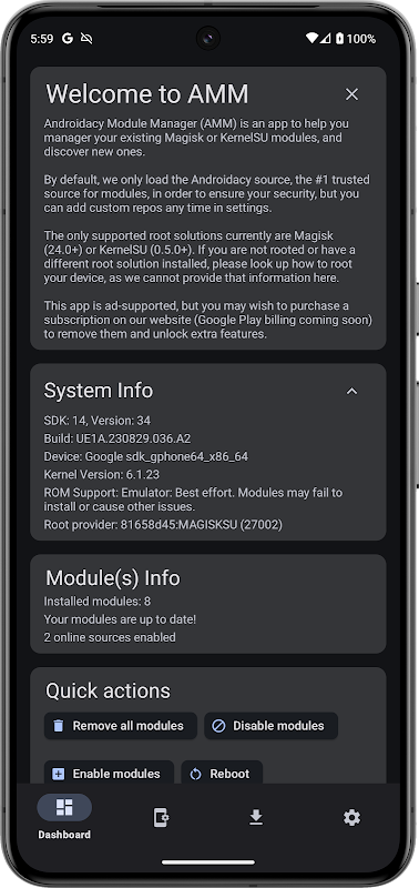 重要情報: モジュールのインストールと管理にはルート権限が必要です。ルート権限を取得していないデバイスでは、モジュールの閲覧は可能ですが、インストールはできません。ルート権限を取得すると保証が無効になる場合があり、正しく実行されなかった場合はシステム問題が発生する可能性があります。Androidacyはルート権限のサポートを提供していません。このアプリを使用することにより、www.androidacy.com/terms に記載されている利用規約および www.androidacy.com/privacy に記載されているプライバシーポリシーに同意したことになります。デバイスの改造に関するすべての責任はお客様が負うものとします。