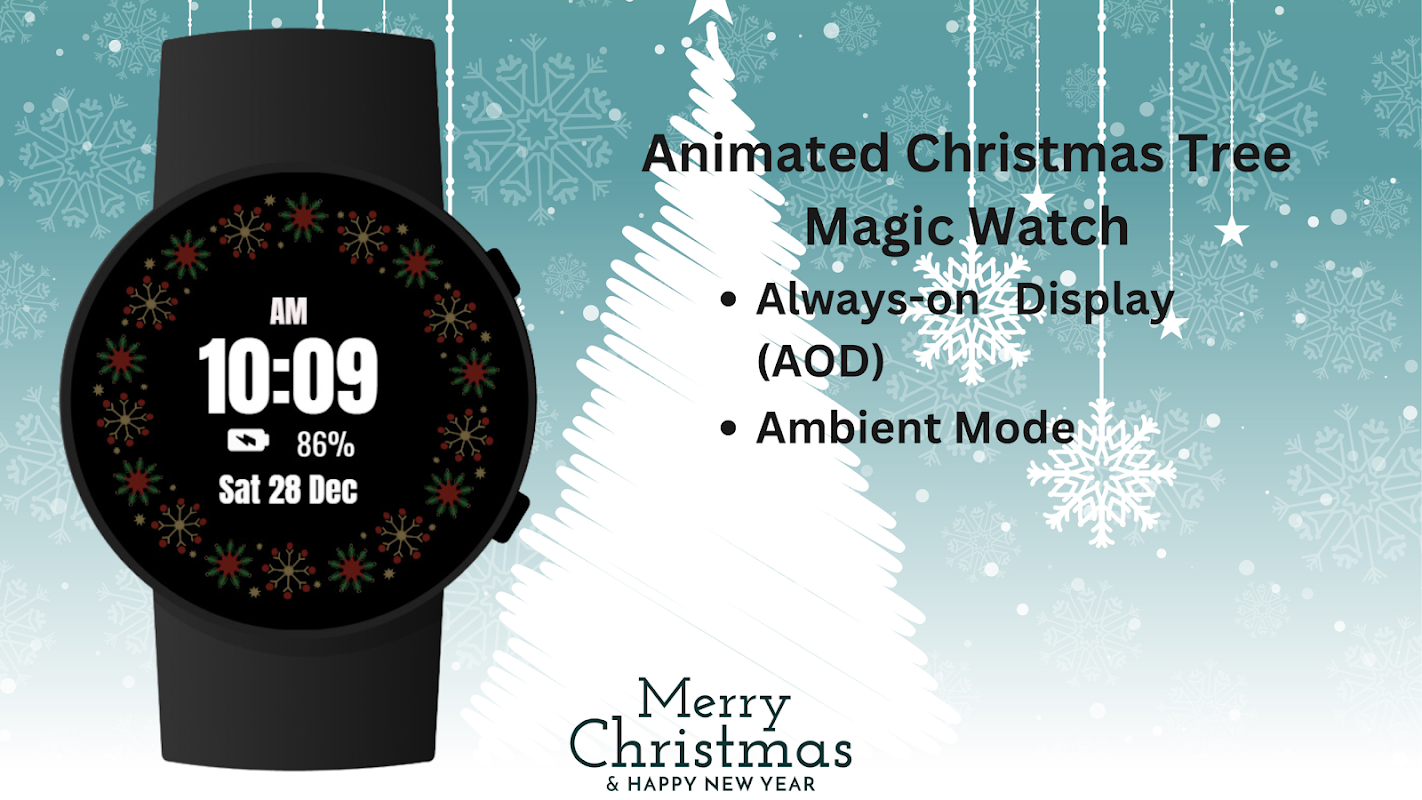 Wear OS 用のアニメーション クリスマス ツリー マジック ウォッチ フェイスでホリデーの魔法を体験してください。この魅惑的な文字盤には、美しくアニメーション化されたクリスマス ツリーが描かれており、デバイスをお祭りの魅力で照らします。手首でホリデー気分を楽しみながら、時間、日付、歩数、心拍数、バッテリー残量をすべて 1 か所で追跡します。