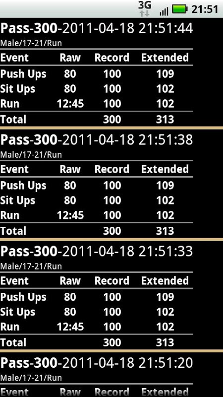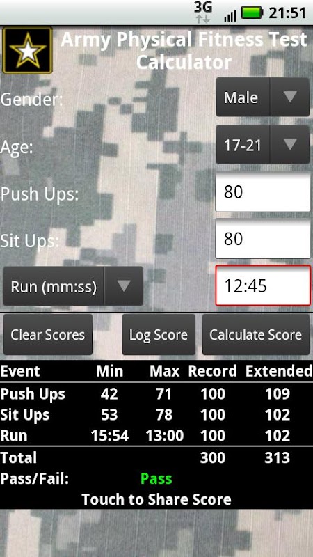 This application can calculate your Army Physical Fitness Score based on the APFT standards listed in FM 21-20.