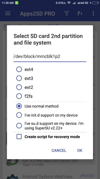 外部SDカード上の2つのパーティション(第2パーティションを作成するために作り付けのパーティションツールを使用します)