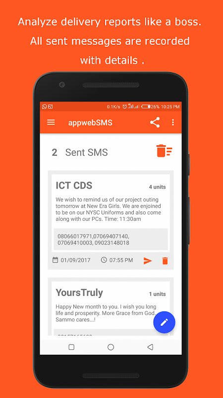appwebSMSはナイジェリアの大手バルクSMSサービスプロバイダーです。ナイジェリアのバルクSMSアプリケーションを使用すると、携帯電話(バルクSMSナイジェリアAndroidアプリ)からbulk1.65までの高速バルクSMSを送信できます。 DND番号を含むすべてのネットワークに追加料金なしで配信します。隠された料金はありません。