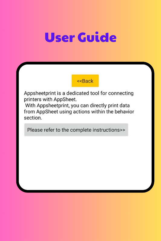 互換性と使いやすさ: 「Appsheetprint: AppSheet プリンター」は、AppSheet と互換性があり、使いやすいように設計されています。 AppSheet 内でアクションを簡単に設定して、印刷データをこのアプリケーションに効率的かつ迅速に送信できます。