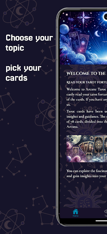 Arcane Tarot は、古代の占い技術をユーザーに案内する、直感的で神秘的なタロット リーディング アプリケーションです。愛、仕事、その他の人生の側面に関する洞察を求める場合でも、ユーザーは希望のトピックを選択し、古典的な 3 枚のカードや複雑なケルト十字などのさまざまなタロット スプレッドから選択できます。アプリはこれらの選択に基づいてパーソナライズされた読み取り値を提供し、深くて意味のある解釈を提供します。