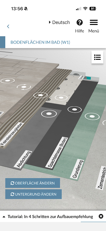 設置アドバイザーは、包括的な設置推奨事項を提供します。直感的なナビゲーションと層構造のグラフィカルなイラストにより、インタラクティブで視覚的に操作しやすくなっています。ユーザーは、部屋、既存の下地、そして希望する表面仕上げを選択するだけで、設置アドバイザーが適切なARDEXシステム構成を提案します。