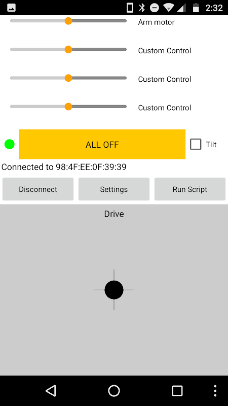 The Ardroid app communicates through Bluetooth Low Energy (BLE) with the robot. It allows driving the robot (with the touchscreen or by tilting the phone) and moving individual DC or stepper motors, with a variety of possible motor arrangements. It also has a simple scripting language to write sequences of actions for the robot to complete. The scripting language is designed to be as simple as possible to use, with no programming experience required.