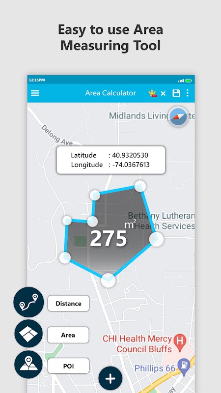 このエリア距離測定アプリには、エリアビューマップ上のエリアと周囲長を計算するためのエリアユニットコンバーター計算機とエリアおよびボリューム計算機があります。エリア推定アプリのアルゴリズムは、GPS座標を使用して、エリアロケーションマップ上のエリアランドを測定します。面積平方フィート計算機と三角形計算機アプリの機能を使用して、面積の単位を小さな面積に簡単に変換できます。面積測定アプリでエリアポイントを選択するだけで、画面に表示されるエリア情報を取得できます。