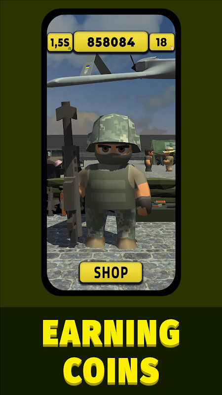 This is a casual single-player simulation game about a Soldier - in the genre of cool idle clicker.