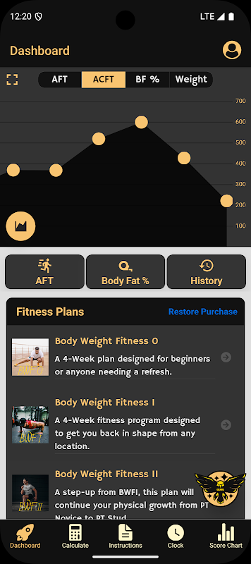 注目すべき機能の一つは、ACFTテスト採点機能です。ACFTテストを最初から最後まで採点できます。身長、体重、体脂肪率などのテスターのプロフィールを保存・管理し、体脂肪率と身長・体重の推移を詳細なグラフで視覚的に確認できます。