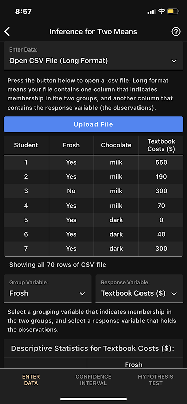 観察結果がいくつかある場合(または要約統計量がある場合)は、単にそれらを入力します。より大きなデータセットの場合は、生データのCSVファイルをクラウドアカウント(iCloudやGoogleドライブなど)にアップロードするか、単に電子メールで送信します。自分にファイルします。次に、アプリでCSVファイルを開き、分析する変数を選択します。スプレッドシートアプリ(iOSやGoogleスプレッドシートのNumbersなど)から生データをコピーして貼り付けることもできます。サンプルデータセットが提供されています。