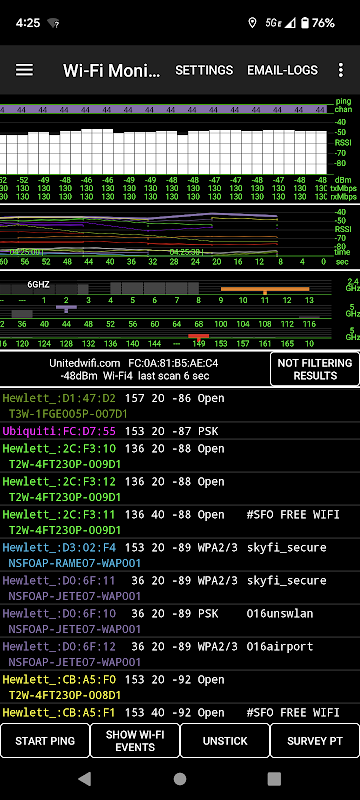 • 現在のアクセス ポイント、RF チャネル、RSSI 測定およびアップ/ダウン PHY レート、デバイスから聞こえる他のアクセス ポイント、およびハンドオーバー イベントなどの Wi-Fi 環境を表示する Wi-Fi モニター。 AP 名が表示されます (もちろん AP で設定されている場合)。
