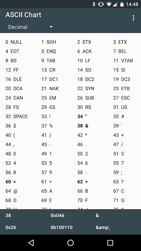 A simple ASCII Chart for developers or anyone who needs to lookup ASCII values for characters. Full character range supported up to 255.