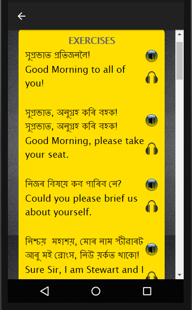 ***** This app is useful in giving you the knowledge of English Basics before you start learning Business English. After completing this tutorial, you will be able to figure out common mistakes In English. Often people jump start with Grammar and Parts of Speech, but it is suggested that you first learn with this Asamiya or Ôxômiya to English Phrasebook. Learn to Speak English by Play & Learn method. You can Learn Languages free using the techniques specified in this learn english magazine. This app gives you a basic BPO Interview Briefing. Once you completely understand the content of this app, you can later choose to learn Idioms & Phrases. Use this speaking english book free and make full use of this speaking english course app. Your next step could also be a group discussion app for interview or an app on English for competitive exams - it will completely your choice. Comprehending English verbs through English listening can also be your future course of action. Here you can also learn to some extend, English for BPO. Learn English by Listening and find here Interview Questions and Answers. You will also be able to Learn English Words or Learn English Vocabulary Daily. This can be your first step towards learning English for Bank Exam. Later, you can refer an Idioms and Phrases Dictionary and strengthen your English. If you are wondering as to how to speak english fluently in 30 days, this can be your perfect destination. We suggest that after you have completed perusing through your app content, you can memorize Synonyms and Antonyms or chisel your English for Banking & SSC preparation.