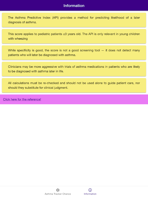 免責事項:すべての計算は再確認する必要があり、患者のケアを導くために単独で使用したり、臨床判断の代わりに使用したりしないでください。 「ぜんそくトラッカーチャンス-ぜんそく予測指数」アプリでの計算は、地域の実情と異なる場合があります。必要に応じて専門医に相談してください。