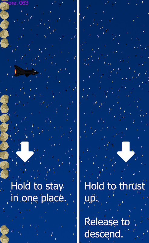 You control a black single seat fighter aircraft lost in space. Your goal is to dodge the asteroids and survive. Gravity is abnormally heavy at higher altitudes and lower altitudes. You will find the flight to be the smoothest at mid center so it is best to stay idle a float along the center of your screen.