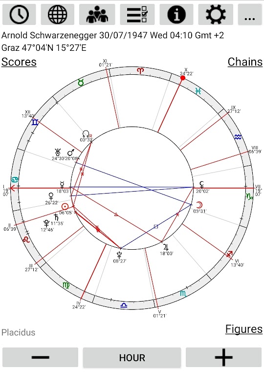 12のハウスシステム、カスタマイズ可能なオーブを備えた24種類のアスペクト、そして指定されたタイムゾーンを持つ約10万ヶ所の都市データベースが用意されており、GMTとの時差は自動的に計算されます。また、新しい都市を追加することもできます。
