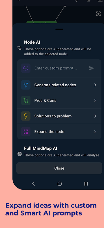 • AIによるノード生成:「関連ノードを生成」「長所と短所」「問題の解決策」「ノードを拡張」といった、ユーザーに合わせたプロンプトでアイデアを瞬時に拡張できます。ブレインストーミングでもプロジェクト計画でも、AIがアイデアの拡張を容易にします。