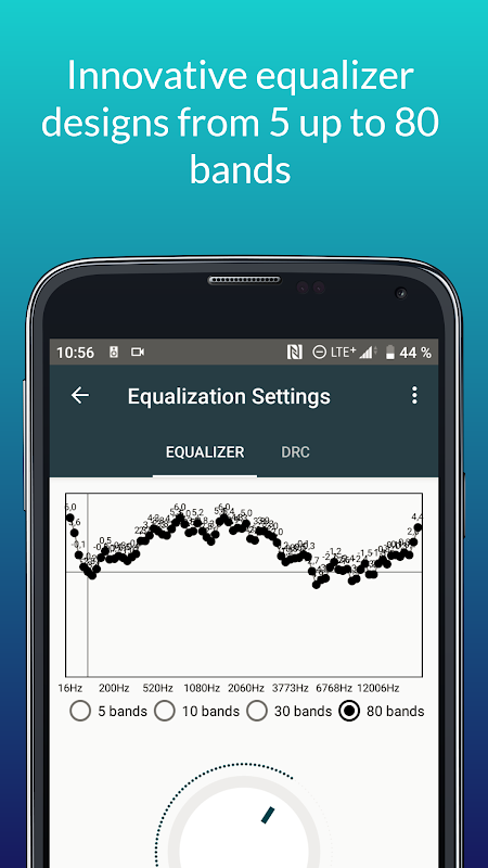 イコライゼーションは、アプリのイコライザーの 1 つを使用して行われます。もちろん、80 バンドのイコライザーは、DRC で最も正確で推奨されるイコライザーです。この革新的なイコライザーは、人間の聴覚をシミュレートするためによく使用されるガンマトーン フィルターに基づいています。人間の聴覚の解像度・精度は個人差が大きいですが、この高精度イコライザーは全ての耳を満足させてくれます。