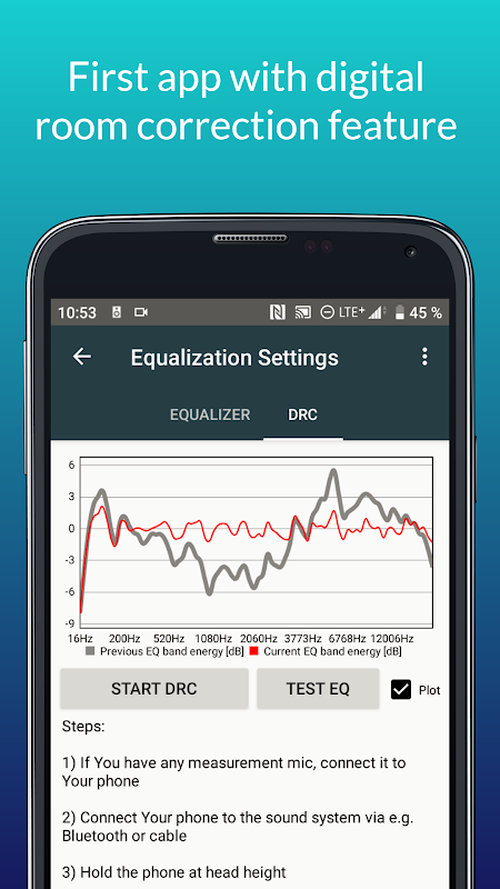 このアプリは、携帯電話のスピーカーから音楽を再生するようには設計されていません。このような小さなスピーカーから曲の音を良くするためにできることはあまりないからです。代わりに、携帯電話をカー ラジオ、AV レシーバー、または Bluetooth スピーカーに接続し、DRC 測定 (EQ 値を決定するため) を行い、音楽を再生してカラフルなサウンドを楽しんでください。