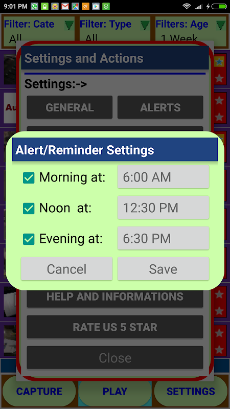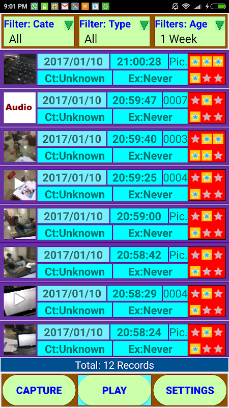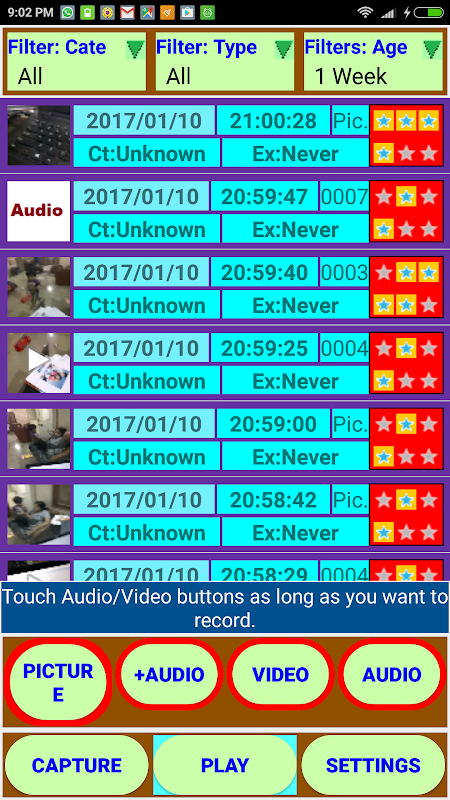 2) Foreground Recording - Launch app and click on CAPTURE button to list option buttons to record picture, audio, audio with picture and video. In case of audio and video keep the button touched as long as you want to record or set the recording duration in "SETTINGS->General Settings"
