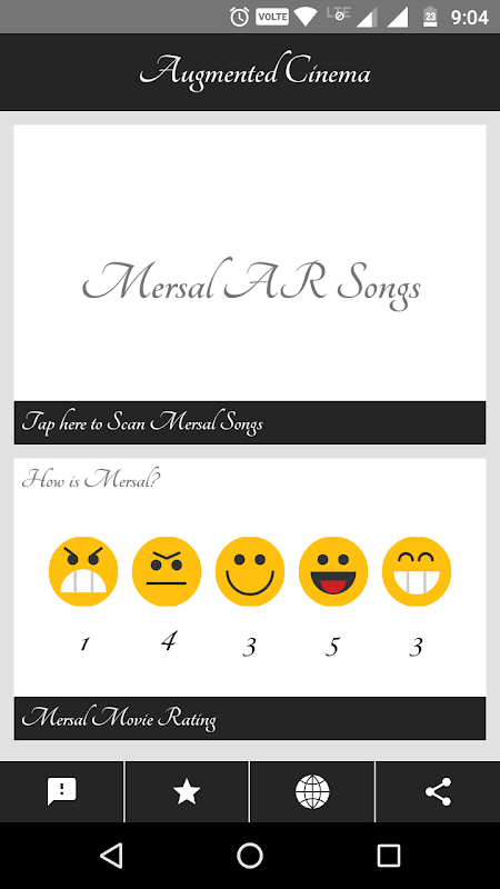 First time in Indian Cinemas Play Movie Songs in Augmented Reality. Thalapathy fans proudly launching this app for thalapaty's "Mersal" movie. Happiness overloaded by all our thalapathy fans. Simply scan through the songs posterd of Mersal in your phone to listen the amazing songs of Mersal. Serving a feast to all our Thalapathy Vijay fans. Install Augmented Cinema App and enjoy the songs.