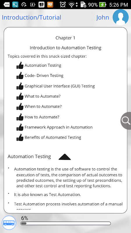 You have limited access to the content provided. For full access to the content, please login and purchase this application. This app provides a quick summary of essential concepts in Automation Testing by following snack sized chapters: