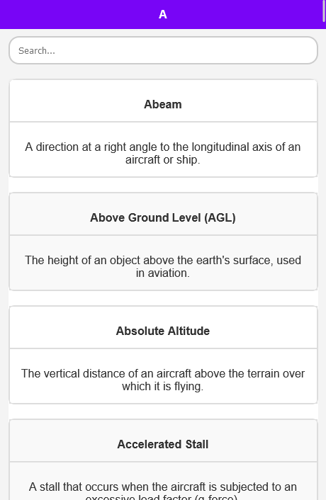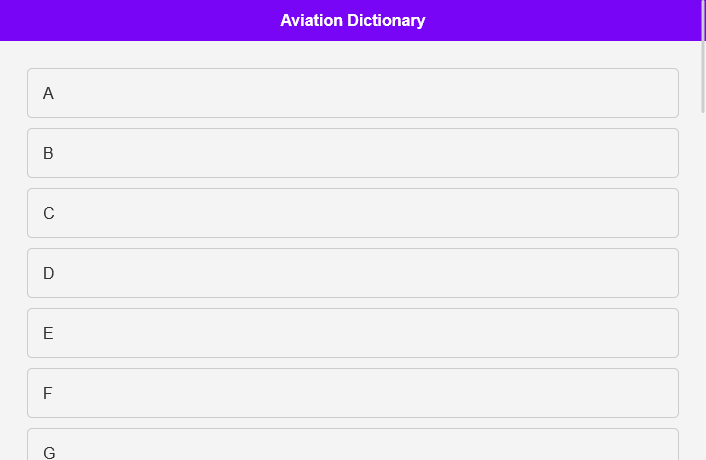航空辞書には、直感的な A ~ Z 形式で整理された航空用語の包括的なコレクションが含まれています。ユーザーフレンドリーなインターフェイスと強力な検索機能により、適切な用語を見つけるのがかつてないほど簡単になりました。各用語は慎重に定義されているため、航空業界のニュアンスを確実に把握できます。基本的な概念から高度な用語まで、私たちの辞書はすべてをカバーしています。