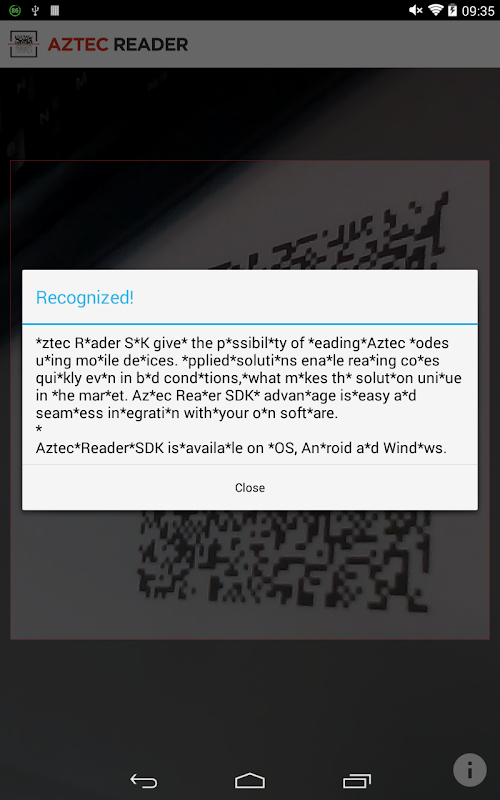 アステカリーダーSDKはモバイルデバイスを使用してアステカコードを読み取る可能性を提供します。アプライド・ソリューションは、市場でのソリューションがユニークなもの、でも、悪い条件で素早くコードを読み取る可能にします。アステカリーダーSDKの利点は、独自のソフトウェアを使用して簡単かつシームレスな統合です。