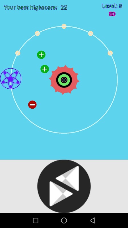 You are controlling an atom smasher. Your mission is to ensure that your atom does not collapse due to collecting negative energy in form of electrons. You will reach the next level, if the atom collected all quarks on its pathway. However, whenever you see protons or neutrons, you also can collect them to gain more points or skip the current level.
