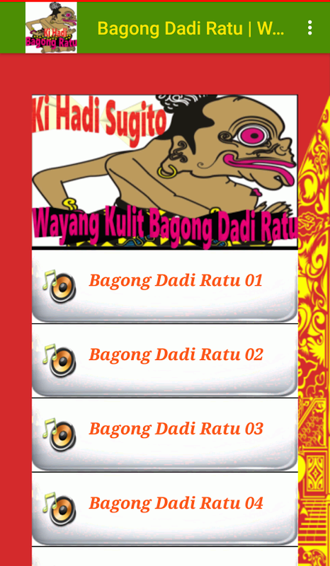 Ki Dalang HadiSugitoが演じるBagongDadi Ratuというタイトルの劇で、ジャワの革人形の最高のコレクションをお楽しみください。バゴン・ダディ・ラトゥの演劇は、最年少のプナカワン、バゴンの冒険を中心に展開し、最終的にラトゥ(支配者)になります。バゴン(リデンアルジュナの僕)はどうやって女王になることができますか?その後、何が起こったのですか?インストールして答えを見つけてください。