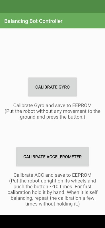 This is an app for controlling balancing robot. On the first startup, the robot will configure to AP(Access Point) mode with SSID "Balancing Robot" and password "12345678". Connect your WiFi to this AP. Once connection is established, open the App and should see telemetry data from the robot, including speed, voltage, power...etc, if not just press the Connect button to connect manually.
