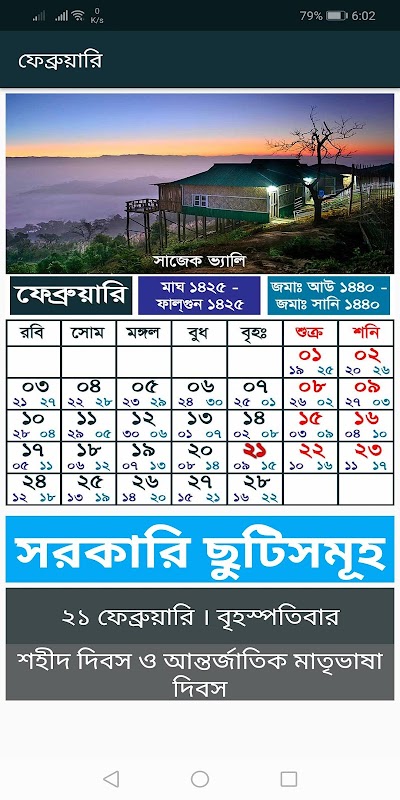 This calendar contains the date of 2019 with government holiday of Bangladesh. It also contain bengali calendar 1425 to bengali calendar 1426 and arabic calendar 1440 to arabic calendar 1441. All this calendar is made for Bangladesh. Only Bangladeshi people should be install this app.