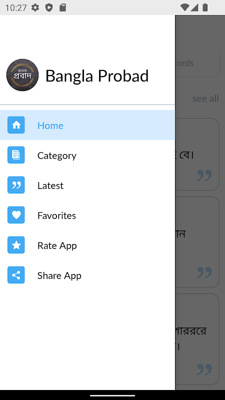 Bangla Probad(বাংলাপ্রবাদ)には、ベンガル語のことわざである一般的なフレーズの幅広いコレクションがあります。アプリケーションの主な機能は次のとおりです。