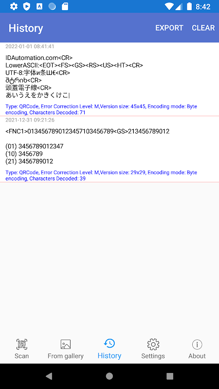 バーコードシンボルをスキャンしてデコードし、エンコードされたデータを確認し、非表示のASCII制御文字、GS1アプリケーション識別子FNC AIコードをデコードして表示し、TLVおよびBase64でエンコードされたテキストをデコードし、シンボルのエンコードに関する情報を表示します。このアプリは、エンコードされたGS1データを解析して、各アプリケーション識別子と要素文字列を分離します。 ISO / IEC 15434で一般的に使用されるFS、RS、GS、CR、LF、およびEOT関数を含む画面に印刷または表示できないASCII関数を明らかにします。Code128、GS1-128、Code-を含む一般的な1Dおよび2D記号をサポートします。 39、ITF、QRコード、データマトリックス、PDF417など。このアプリの主な目的は、www.idautomation.comのバーコードフォントで作成されたバーコードでエンコードされたデータを検証することであり、他の同様の目的にも使用できます。