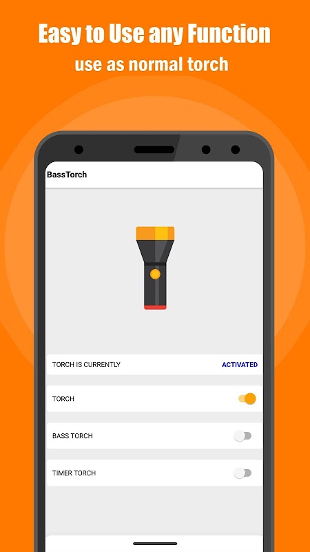 You can use this app to normally turned on and off your flash light or else you can use basstorch function to control your flashlight accordingly to your voice or mobile sound frequency as well as you can set frequency meter as you want and you can set timer option if you want torch should blink it is turned on, timertorch is also a good feature to control your flashlight in the given time interval.