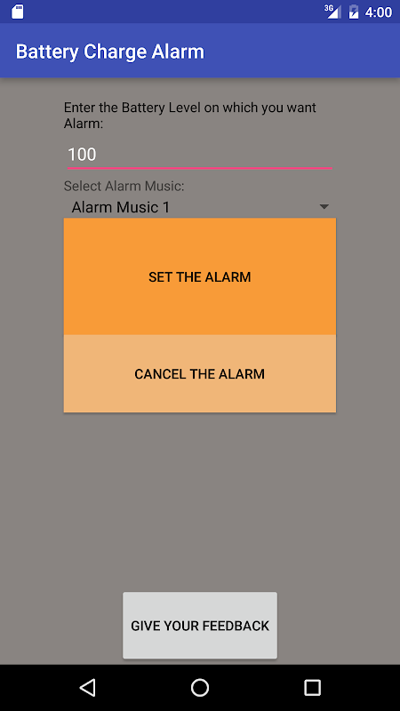 This app is simple and easy to use. Just enter the battery percent on which you want Alarm and click on the set the Alarm button. And, that's it. It's very simple and smart app.