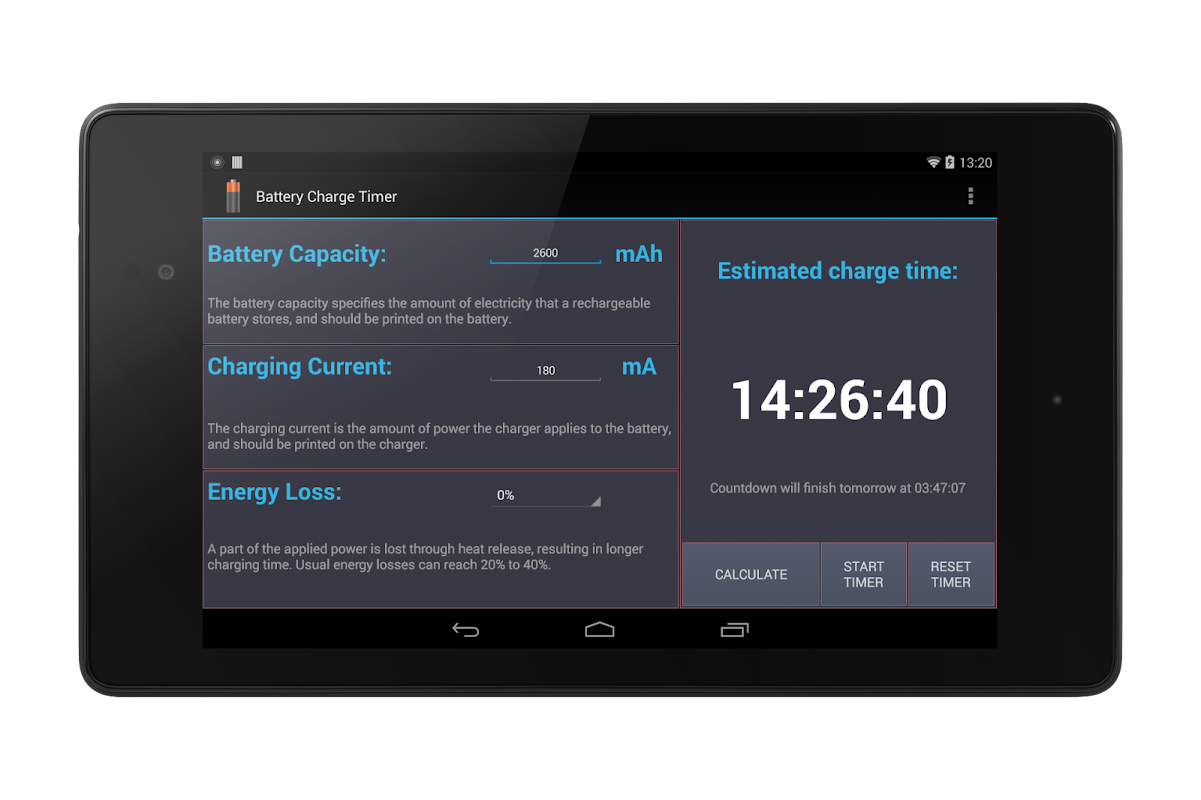 バッテリ充電タイマを使用すると、電池容量、充電電流、およびエネルギー損失に応じて、充電式電池を充電するのに必要な時間を評価することを可能にします。あなたはそれが充電器を切断する時が来たとき​​に警告する場合は、あなたに通知するタイマーを設定することができます。あなたの充電式電池を最大限に活用したい場合は、このアプリはあなたです!