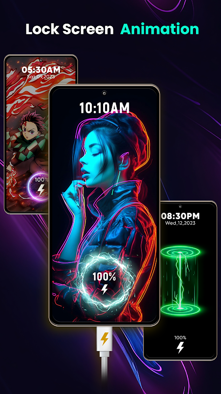 充電アニメーション背景写真適用アプリは、多くの魅力的なアニメーション効果で充電プロセスを追跡するための楽しくて興味深い方法です。新しい 3D バッテリー充電アニメーション写真 アニメとナルトには、デバイスの充電に伴ってバッテリー シンボルがいっぱいになる稲妻が含まれています。充電器に接続すると、アニメ、ワンピース、ナルトのアニメーション コレクションが Android デバイスに表示されます。