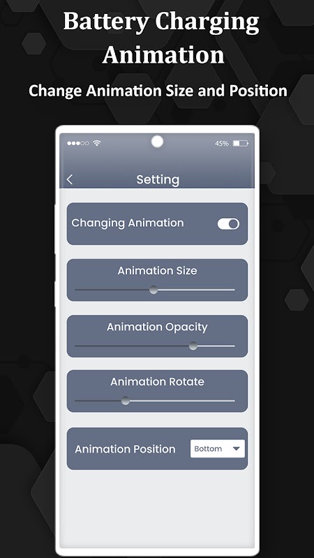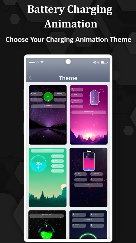 魅力的なバッテリー充電アニメーション画面と本物のクールなアニメーショングラフィックを入手して、より良い充電を実現します。また、これはすべて、テキストの色と背景の選択によってカスタマイズできます。