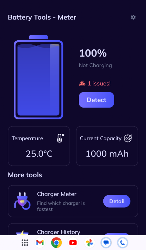 Battery Tools - Meter は、バッテリー情報を提供するバッテリー監視アプリで、エネルギー消費を制御できます。メイン画面には、バッテリー残量や温度レベルを警告するための通知などの機能が表示されます。充電器履歴は各バッテリ充電の履歴を保存し、充電器メーターはバッテリパラメータをチェックします。