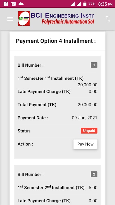 このアプリでは、学生は自分のプロファイル、結果、ルーチン、出席レポート、支払い契約を表示し、(bKash、Rocket、Nagad)で支払いを行い、モバイルバンキングの支払い請求システム(bKash、Rocket、Nagad)の請求番号を見つけることができます。支払い履歴など。