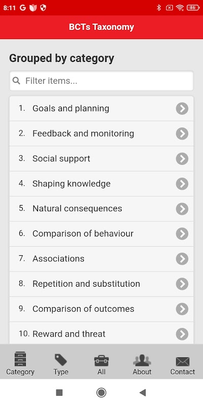 このアプリはMichieらによって公開されたBehavior Change Technique Taxonomy v1(BCTTv1)のナビゲートが容易で完全に検索可能なバージョンです。 (2013)。