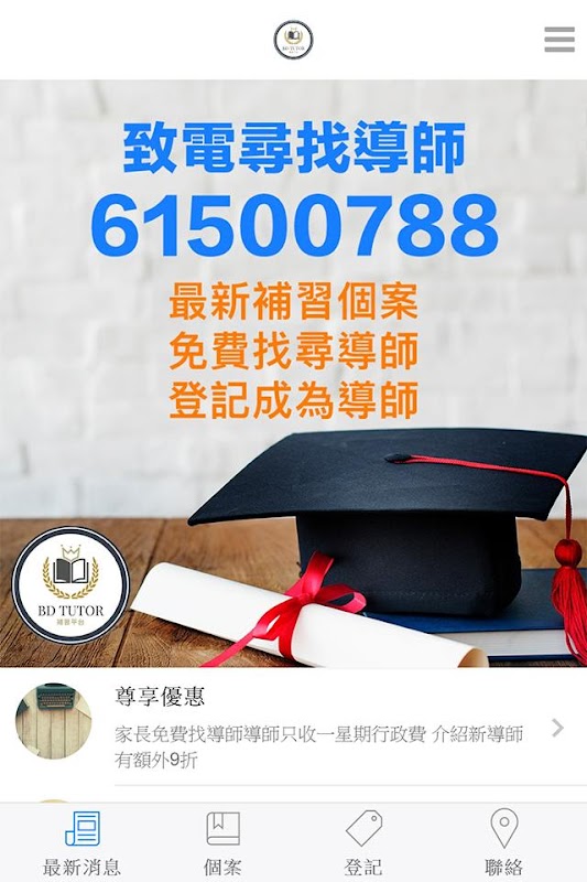 BDTutor 補習平台, 以配對系統提供私人補習導師的補習配對中介平台。 本會為家長作出專業的導師介紹,為中小學生提供來自港大、中大、科大等各大專院優質的上門補習導師。簡單登記,導師與家長共同找到對的選擇。為學生提供最合適的補習導師 。
