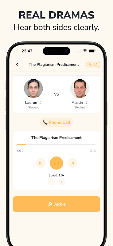 シナリオカードを選び、それぞれの意見に耳を傾け、判断を下しましょう。あなたの選択は重要です。すべての判断はプロフィールを更新し、新しい事件をアンロックし、グローバルリーダーボードの上位へと押し上げます。判断力が向上するにつれて、コインを獲得し、実績を集め、称号をレベルアップさせましょう。これは、裁判官ゲーム、意思決定ゲーム、そしてソーシャルゲームが一つになったゲームです。読み、議論し、陪審員ゲームのように投票し、誰が正しいのかを判断しましょう。
