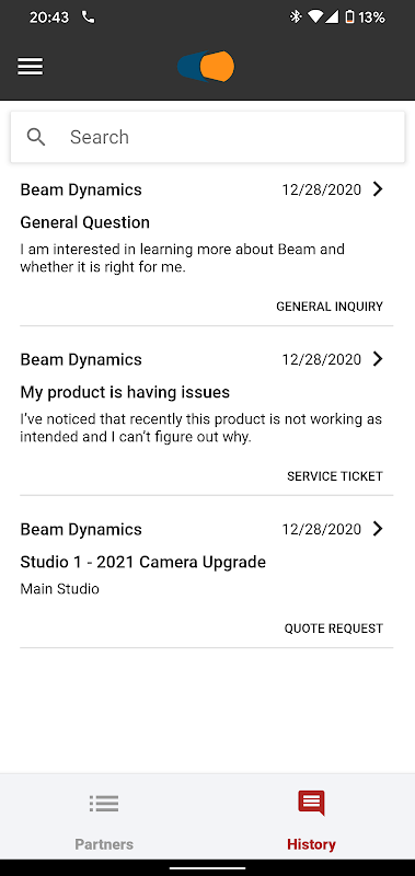 See Your History | Beam tracks all of your service ticket submissions, quote requests and logged calls with vendors. Forward the information to your team and coworkers so that everyone is up to date on equipment issues and quote requests.